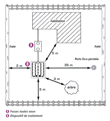 L’assainissement non collectif exige une surface minimale sur la parcelle en tenant compte des distances à respecter vis-à-vis de l’habitation, des limites de propriété, des arbres, des puits, etc.